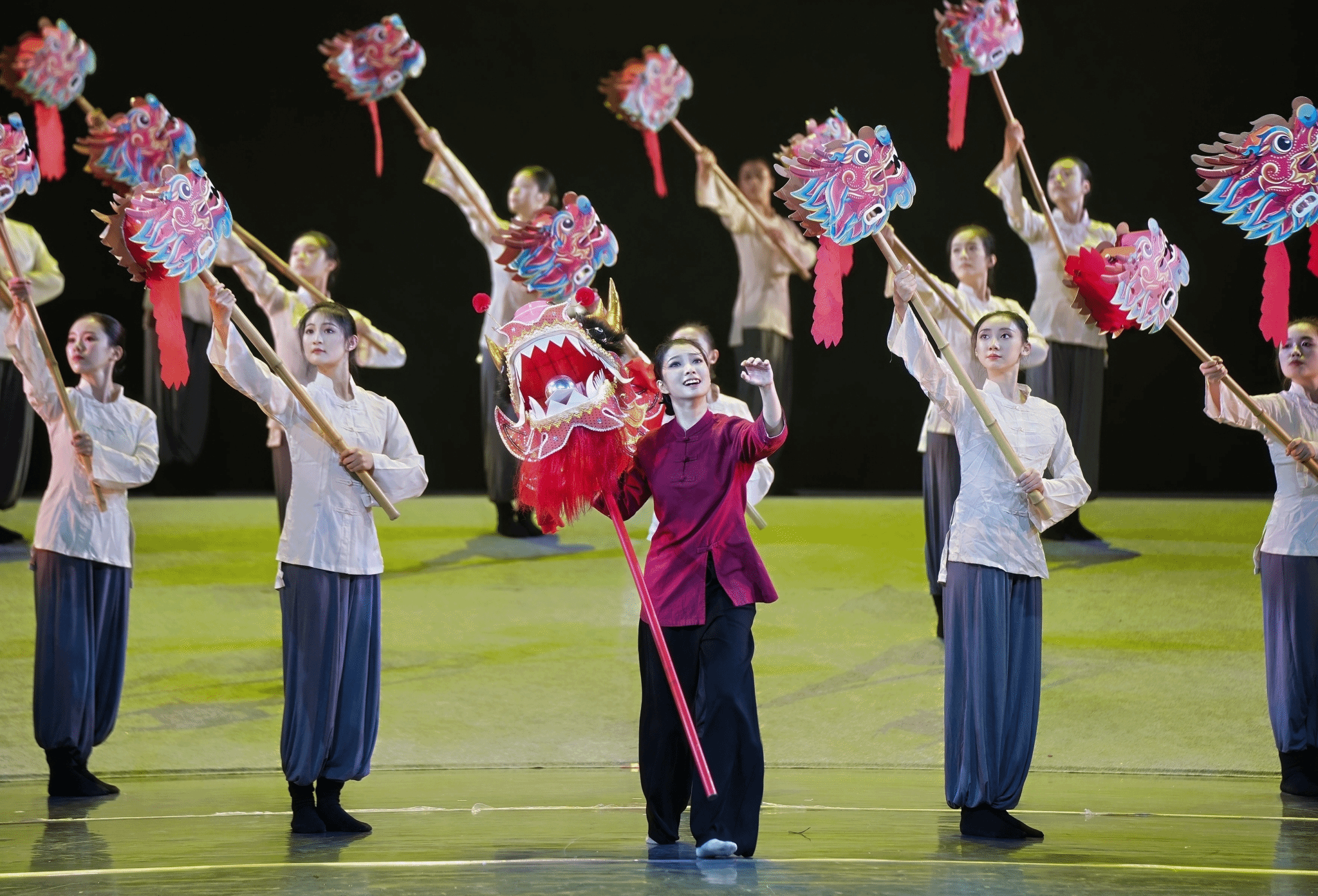 舞台上,演员以精湛舞技和饱满情绪,将“以龙拼字、以字喻意”的独特魅力展现得淋漓尽致。瓯越山水意境与数字媒体技术交融,龙形道具精准变幻出“合”“美”“天下太平”等祥瑞字样,赢得阵阵掌声。“舞台效果好、情感渲染力强,故事特别动人。”学生潘同学说。市民林先生带着孩子观演:“借这个机会让孩子了解非遗,希望能有更多这类演出。”