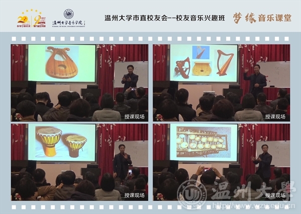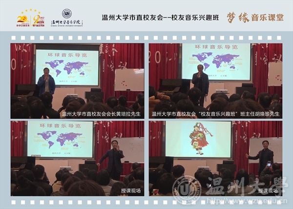 11月26日晚,温州大学市直校友会“梦缘音乐课堂”在温州大学学院路校区校友活动中心如期开始。王文韬老师以《环球音乐导览》为题,用近两个小时引导校友们徜徉于五大洲!据主讲王文韬老师介绍,设计该讲内容的目的有三:一,与校友们共享环球音乐文化艺术资源;二,引导校友们用全球性的视角看问题,以客观、平等、包容的态度,对待自己不熟悉、不了解的各种民族音乐,以树立正确的世界音乐文化多元观;三,打破以某一、两种音乐文化为中心或审美标准,进而忽视、代替其它的人类音乐文化瑰宝之现状。