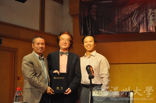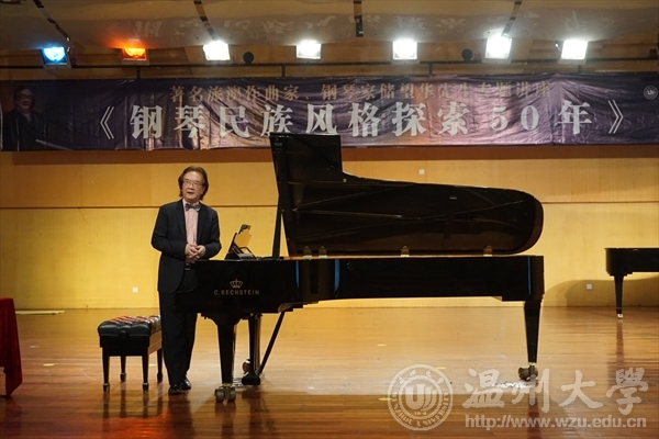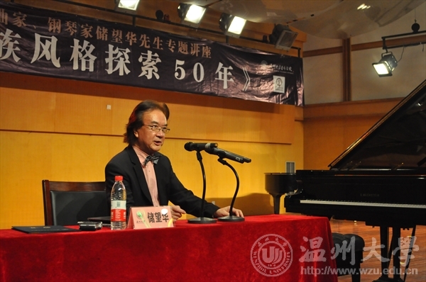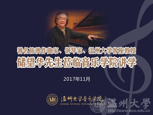 2017年11月7日著名旅澳作曲家、钢琴家储望华先生受邀抵达浙南这座山水秀美、气候宜人的温暖之城——温州。11月8日下午,储望华先生来到“‘珠江凯撒堡奖学金’温州大学第七届钢琴比赛决赛”现场并任评委主席。他对选手们的表现很满意并予以热情的鼓励。储望华先生说:“今天的比赛有不少优秀的选手,特别是几位演奏中国作品的选手,很棒!”。是日下午6点,储望华先生为温州大学第七届钢琴比赛获奖学生颁奖并观看了颁奖音乐会。当天晚上,储望华先生为威尼斯wnsr666及慕名而来的嘉宾们举办了一场令人难忘的专题讲演——《钢琴民族风格探索50年》,并接受威尼斯wnsr666党总支方建敏书记颁发的客座教授聘书。威尼斯wnsr666王文韬副院长主持了系列活动。11月8日晚,76岁高龄的储望华先生在天瑞音乐厅为威尼斯wnsr666师生举行了长达两个半小时的讲演。储先生以深情、悠扬的琴声为纽带,从他少年时改编的《拜厄练习曲NO.88》说起,回顾了其近60年中国风格的音乐创作历程及其永不泯灭的华夏情怀。讲演活动气氛热烈,储先生精神抖擞,自语“革命人永远年轻”!两个多小时的激情澎湃,陶醉了多少台下的粉丝们,而忘情的先生却连口水都没来得及喝!储望华先生侨居海外近40载,但他对祖国民族音乐文化之刻骨铭心的热爱,其拳拳之心以数量庞大、上演不衰、历久弥新的音乐作品为鉴!正如储望华先生自己所言:“了解中国钢琴音乐,要从中国民歌、古今中国民族器乐曲、中国戏曲、书法、国画等艺术中吸收营养和影响。有了这种了解和认识,才可能深入探讨和研究中国钢琴音乐文化的形成和发展,及中国钢琴作品中的民族风格特性的形成。”储先生是这样说的也是这样做的。当晚,威尼斯wnsr666师生沉浸在储先生深情的歌声、悠扬的琴声及绵绵细雨般的话语里,伴着储先生传奇式艺术人生之诉说,令在场的“储粉”们惊喜不断。当活动接近尾声之际,储望华先生通过大屏幕、十分谦和地抖出了让听众屏气凝神的“包袱”——以其音乐创作为素材之大量笔酣墨饱的书法作品,无论楷篆行草,其字形正倚交错、大大小小、开开合合以及运笔线条之粗细皆跌宕有致。正当一众粉丝唏嘘不已之时,先生又亮出了他创作的大量绘画、篆刻,油画、水彩画、扇面、靠垫、水杯彩绘、红酒商标等作品,或传统、现代,或具体、抽象,真可谓音、书、画、篆水乳交融。