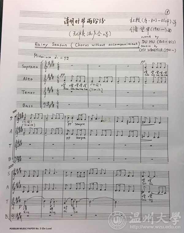 储望华先生2017年12月7日创作完成的无伴奏混声合唱《清明时节雨纷纷》手稿