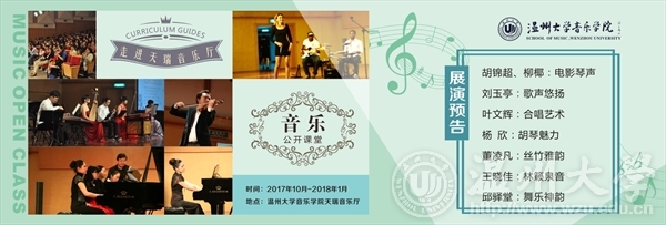 据本系列音乐公开课总负责人刘玉亭老师介绍,本学期还为温州大学的师生精心准备了7场公开音乐课堂,将在2018年元月之前陆续推出。以讲演音乐会举办日期先后为序,主要包括:许天鸣老师的“走近音乐”、杨欣老师的“胡琴魅力”、叶文辉老师的“合唱艺术”、刘玉亭老师的“歌声悠扬”、董凌凡老师的“丝竹雅韵”、王晓佳老师的“林籁泉音”、邱驿棠老师的“舞乐神韵”。