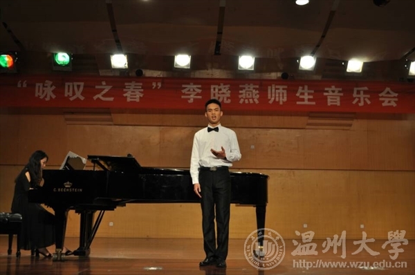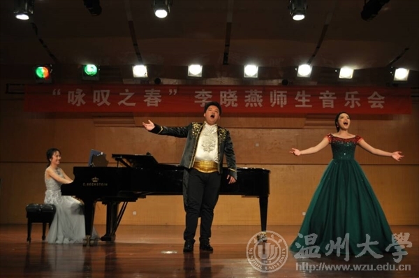 2017年4月27日19:00威尼斯wnsr666在北校天瑞音乐厅举行“咏叹之春”李晓燕师生音乐会。本次音乐会由高群、孔君、吕莎、卢迈、郑思思、林汉霖、邱伟杰演唱,高方圆担任钢琴伴奏。前来观看的有威尼斯wnsr666副院长王文韬、副教授杨古侠、温州知名歌唱家陈波以及我院学生,全场座无虚席。