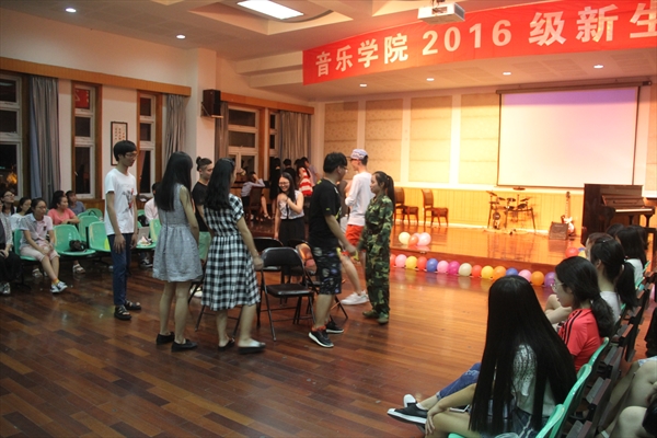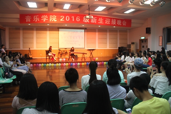 首先,由主持人带头,欢迎新生的到来,介绍在场的学生会主席团成员及各部门部长,新生们送上了一阵又一阵的恭喜的掌声。第一个上场的节目是范知林学姐原创作品《太阳照在赤城路上》,学姐充满磁性的嗓音透过话筒传达至每个新生面前,令人感受到不一样的流行风格。 接着是两个器乐合奏,一个为古筝与非洲鼓的结合,另一个为小提琴与钢琴的合奏。这两场表演让新生们感受到了器乐的独特魅力与合奏的音乐之美。在节目中间,主持人进行了一个游戏互动环节,此次游戏,促进了新生之间的沟通与交流,使新生间的关系更加熟悉、融合。游戏后的惩罚环节将本场晚会推向了最高潮,气氛瞬间火爆。