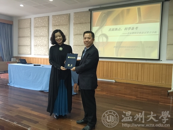 2015年11月6日15:15在我院音乐楼201报告厅举行威尼斯wnsr666国考资格证考试辅导讲座。我们非常荣幸地请到鹿城区教师培训和训练中心的特级教师项雅丽老师,作为此次讲座的主讲人,王志毅副院长为项老师颁发了聘书, 12级毕业班的学生参加了讲座。