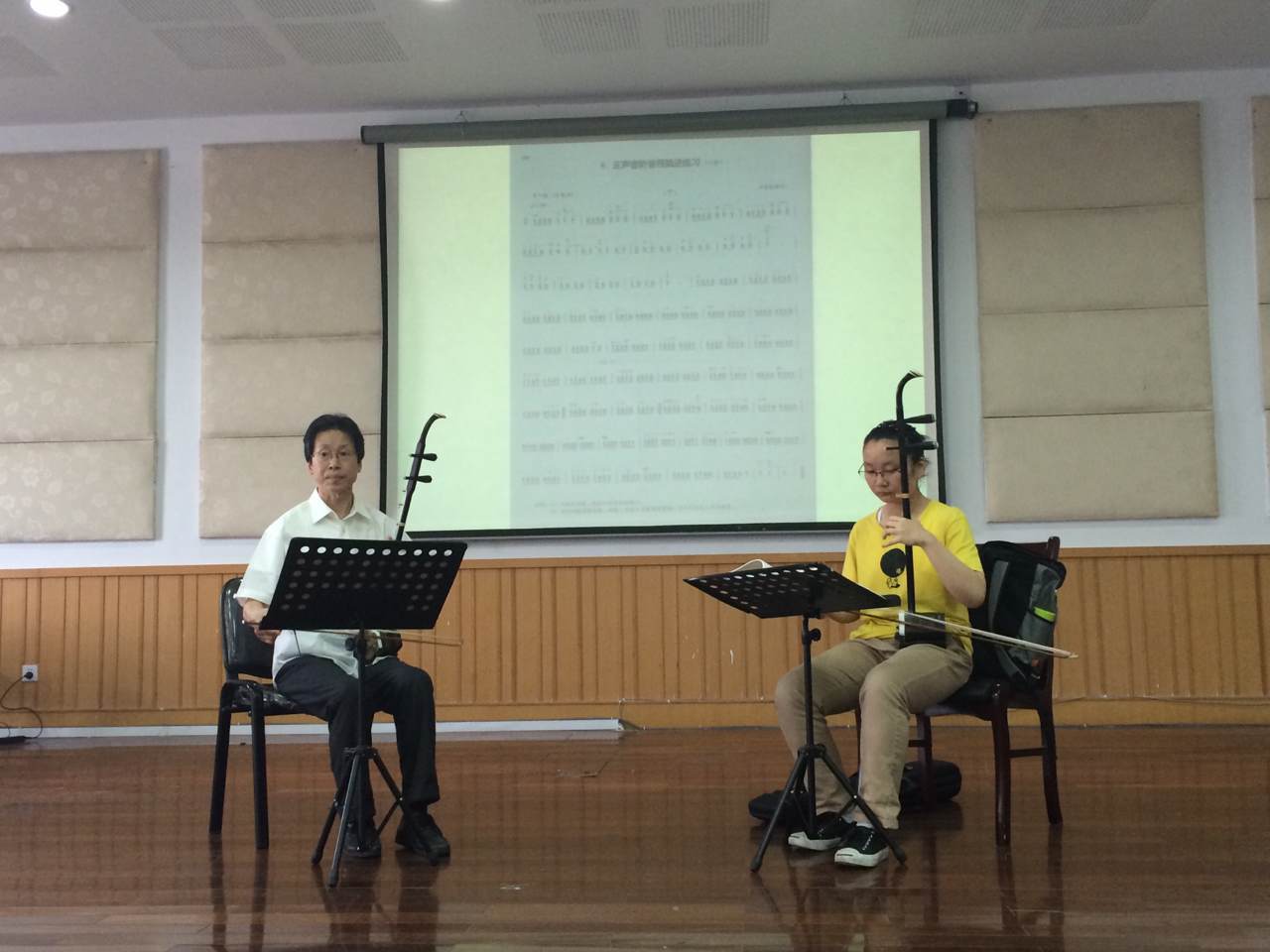 2015年5月11日上午9点50,在温州大学音乐楼201,乔志亮老师给大家上了第二节课器乐公开课。受教学生是12音表本的二胡主修学生朱玉铭同学。