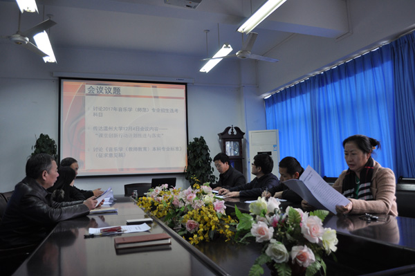 会议主要讨论了2017年音乐学(师范)专业招生选考科目事宜。省教育厅提出了“3+X”模式。经过权衡,会议以为,我院的招考对象要参加人文、历史等相关科目的考试,这有利于我们对学生的培养。并初步确定,除语文、数学、外语这三门必考科目外,要报考温州大学音乐学(师范)专业,需要考以下三门学科之一:政治思想、历史、技术。