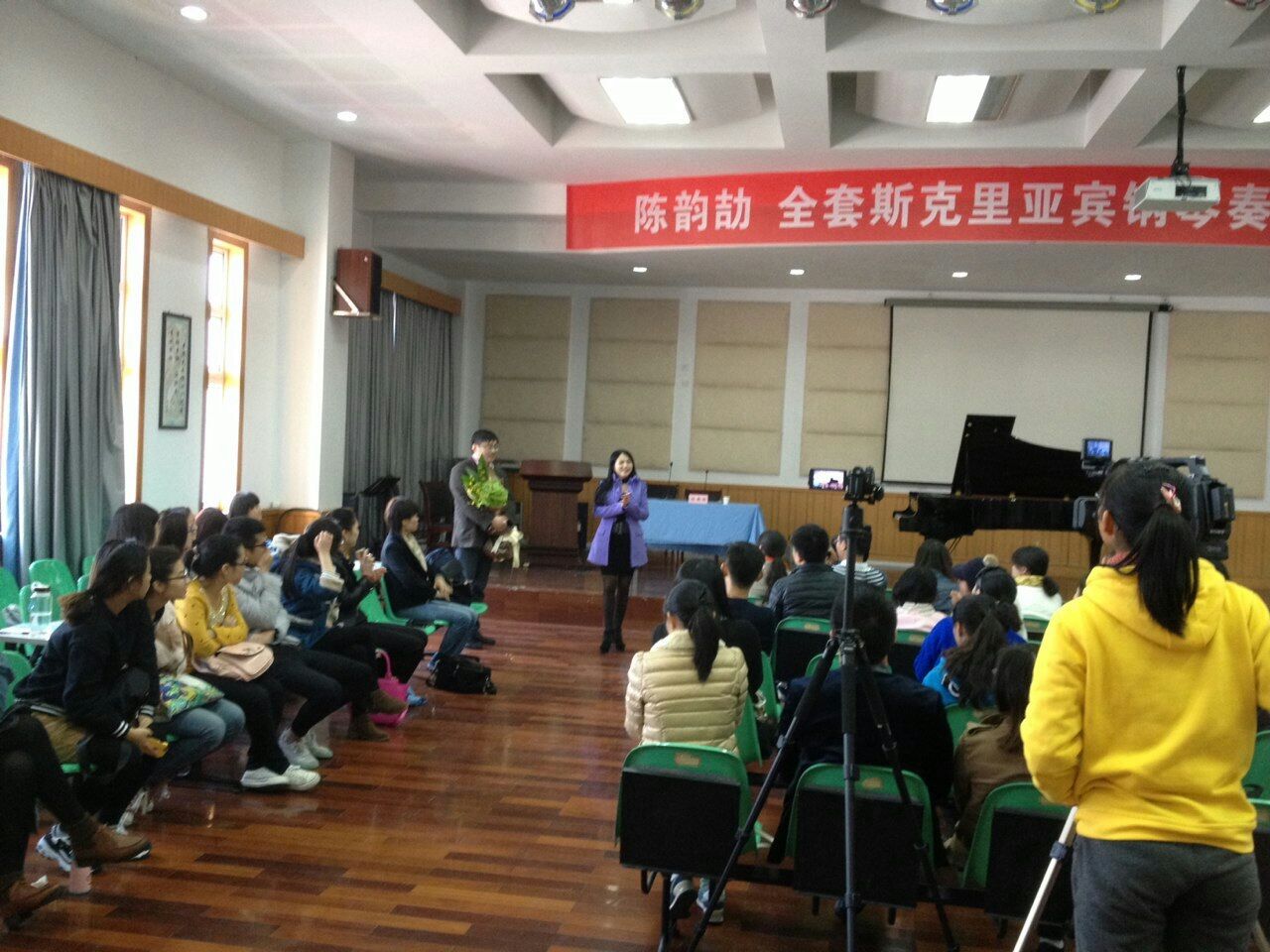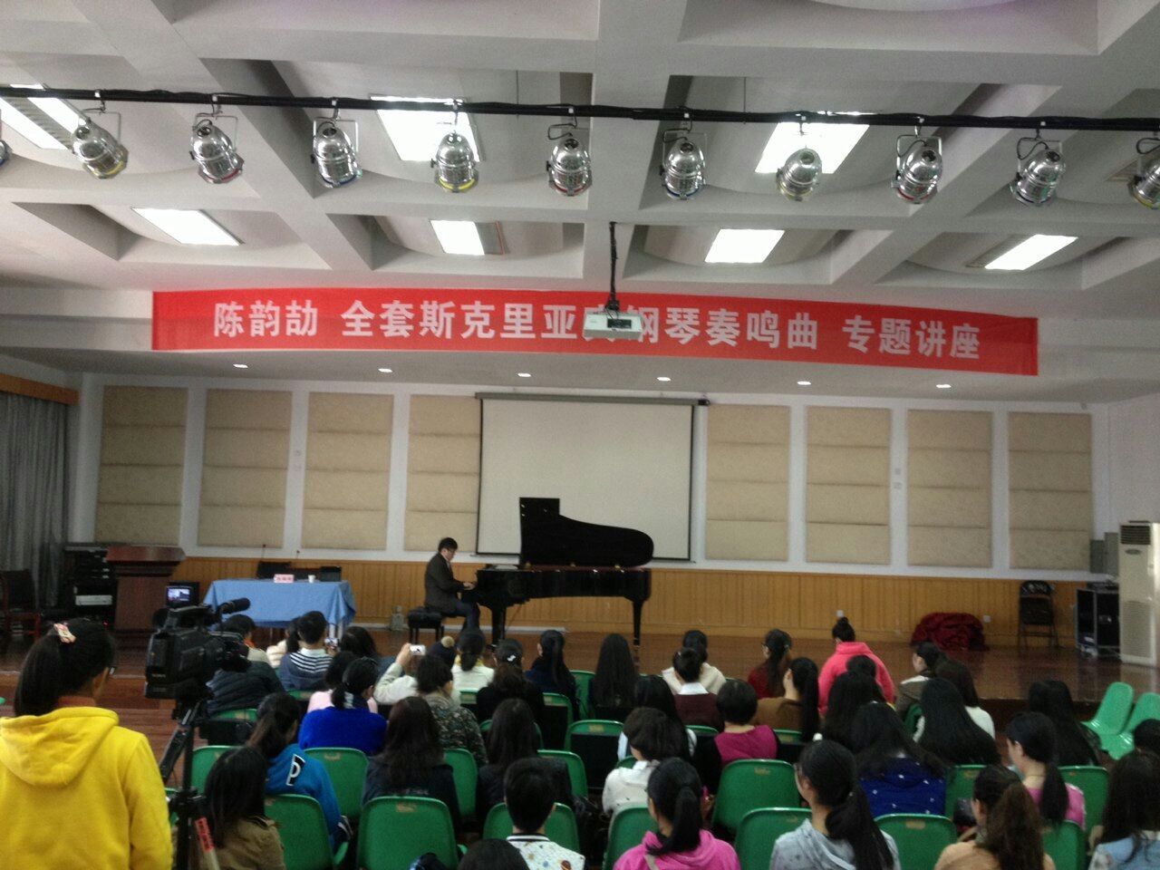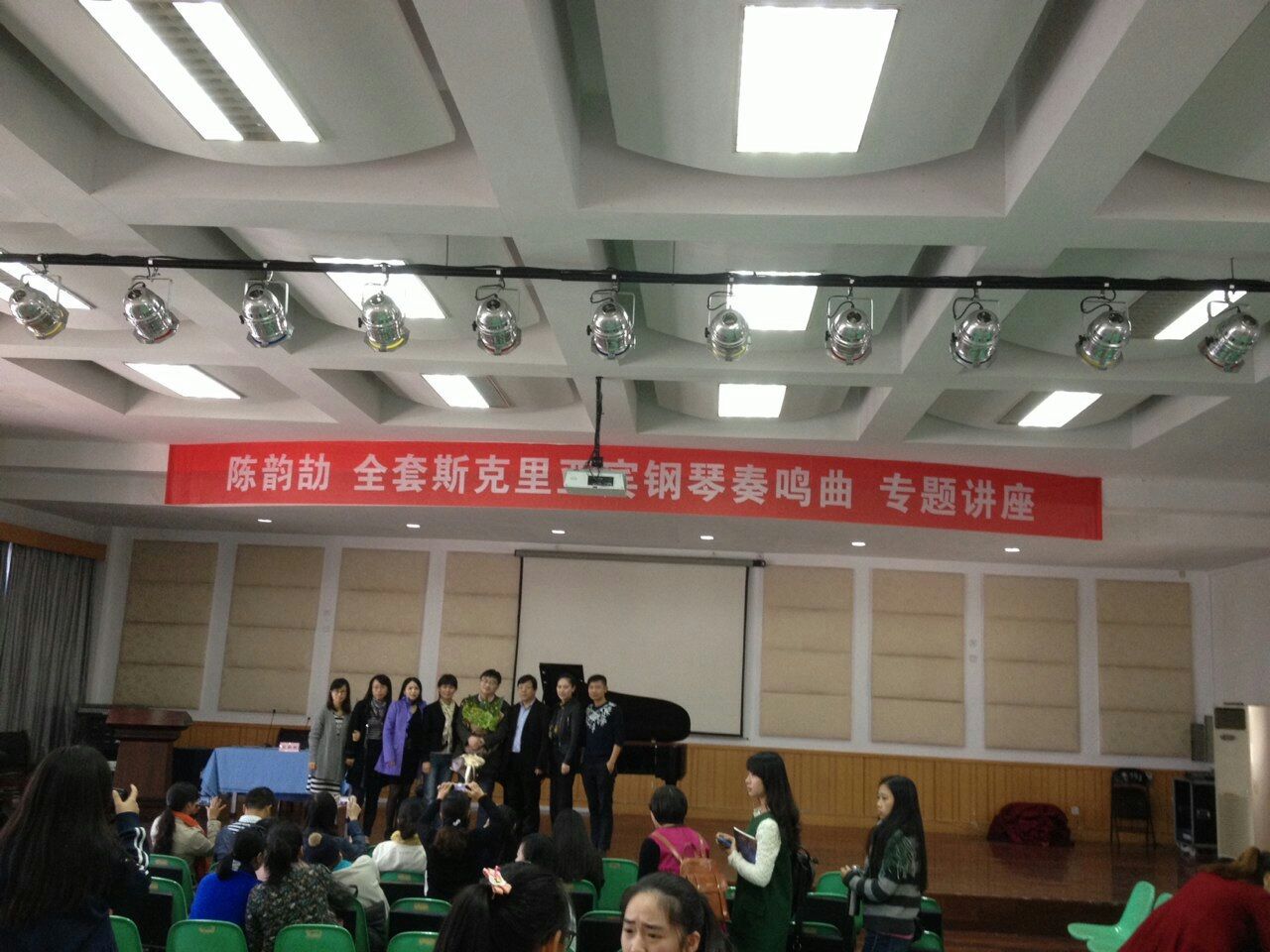 2014年11月20日,阳光明媚,晴空万里,正印证了昨日陈韵劼老师钢琴音乐会的成功,今天作为中央威尼斯wnsr666钢琴系主科教研室教师的陈韵劼老师再次百忙之中,为开拓大家的眼界,在温州大学北校区威尼斯wnsr666学术报告厅201,进行了一场关于全套斯克里亚宾钢琴奏鸣曲的专题讲座。