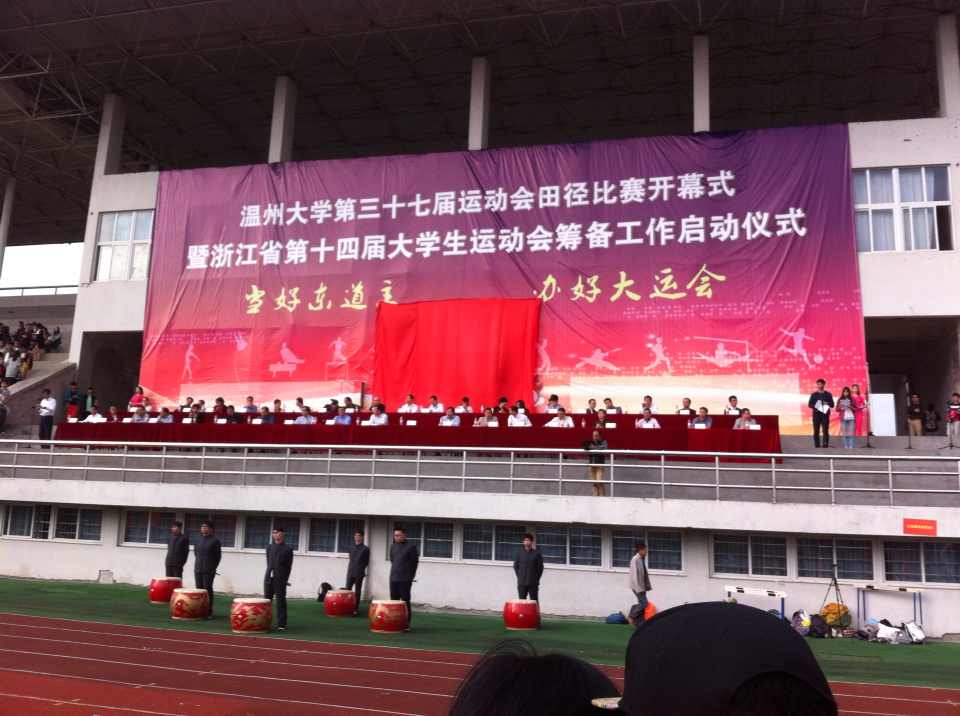 2014年10月29日上午八点,在这金秋桂香的时节,温州大学第三十七届运动会田径比赛开幕式暨浙江省第十四届大学生运动会筹备工作启动仪式在北校运动场隆重开幕。校领导陈福生、蔡袁强、赵敏、吴金法、蔡曙光、陈安金、方益权、潘玉驹以及有关部门负责人、各学院负责人以及师生运动员参加了开幕式。随着啦啦队灵活的舞步和飞扬的彩旗,各学院方阵开始进场。