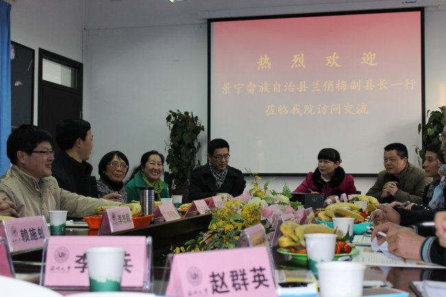 2013年12月19日下午15:00,在音乐楼309会议室,景宁畲族自治县兰俏梅副县长一行人来到我院进行走亲考察活动,赵玉卿院长、刘青松书记、李杰鹏副院长、王文韬副院长以及我院相关教师热情接待了考察组。