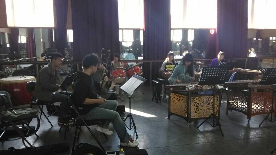 “民乐团排练”在北校音乐楼三楼排练厅进行,这次的艺术周里,民乐团一共有三次的排练机会,本次排练有实验艺术剧院民乐团全员及团长董凌凡参与。排练的曲目为《春节序曲》,乐曲描写的是过春节人们扭秧歌的情景,旋律明快,生动地表现了我国人民在传统节日里热闹欢腾、喜气洋溢、敲锣打鼓、载歌载舞的场面。民乐团还加入了民族打击乐器,将音乐逐步推向高潮,节日的欢腾景象和人们的喜庆心情被表现得淋漓尽致。团长董凌凡对民乐团的排练亦是精益求精,每个乐器的表达都要求精准,达到整体为一体的效果。在民乐团如此紧锣密鼓的排练时,合唱团和室内乐团也在努力排练着。