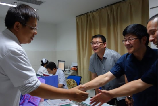王处长、方书记、刘书记向主治医生询问殷舒的身体状况及治疗方案