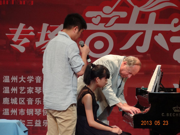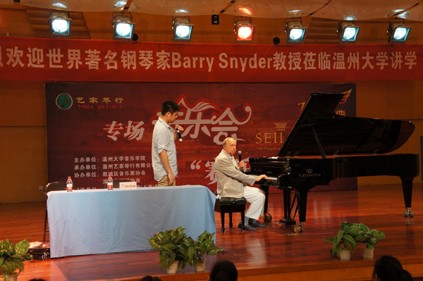 2013年5月23日(周四)下午14点整,温州大学80周年校庆系列学术活动之“如何用‘耳朵’弹琴”在北校音乐厅隆重举行。在众师生的期盼下,我院十分荣幸地邀请到了世界著名钢琴家百瑞·施耐德教授(Barry Snyder)进行学术讲座及大师班。