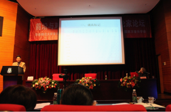 我院院长赵玉卿教授受邀参加了本次会议,并在大会上作了《关于姜白石俗字谱歌曲的宫调及音阶研究》的发言。关于对白石道人俗字谱歌曲的研究,目前在宫调问题上的分歧主要表现在黄钟律的绝对音高标准、调高标记以及音阶等各方面。论文从俗字谱歌曲的调高标记、音高标准、音阶等方面阐述,提出:在绝对音高标准问题上,认为采用北宋时期的黄钟律高标准,即以D为黄钟作为姜白石俗字谱歌曲的音高标准应该是最接近白石谱原貌的。姜白石俗字谱歌曲所采用的音阶则是“古音阶”的形式。发言后与其他专家学者进行了互动对话,得到与会者的肯定。