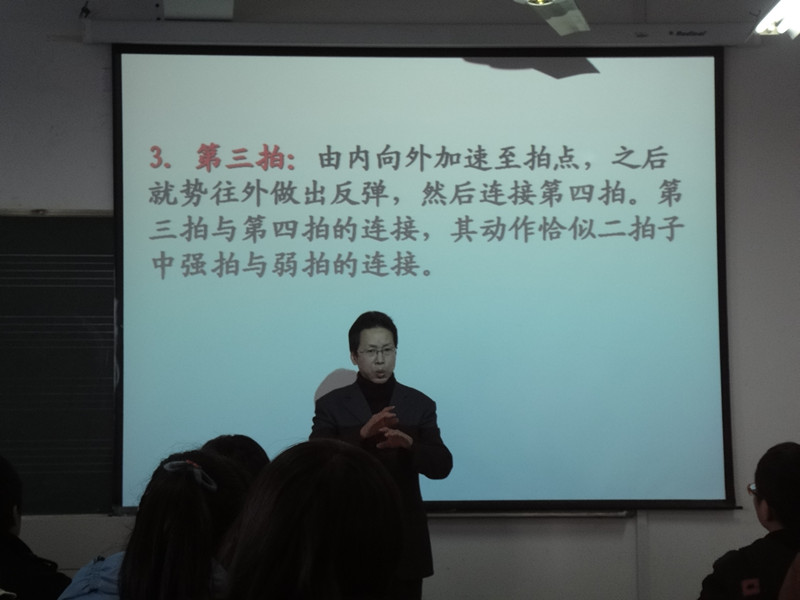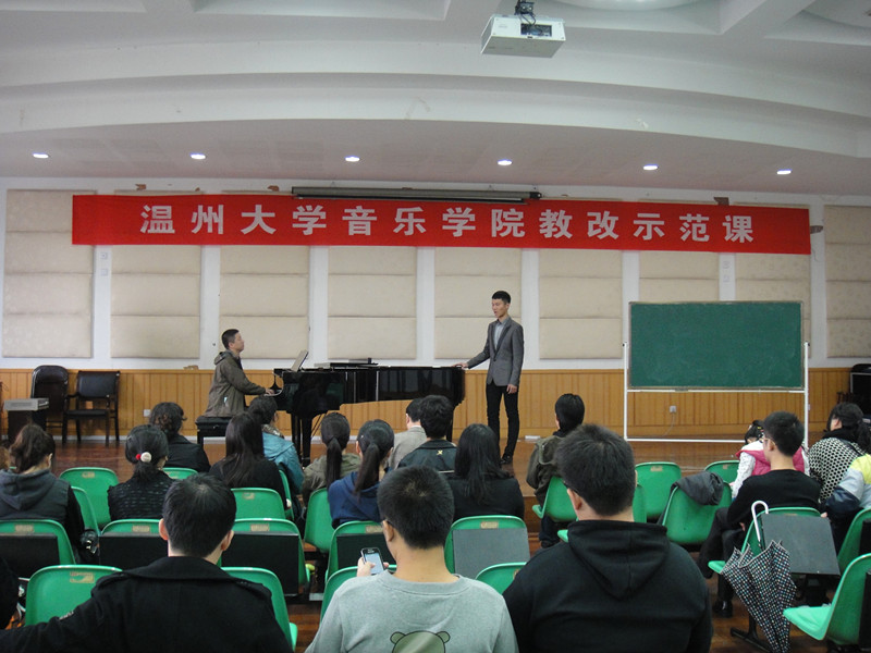为了迎接即将到来的温州大学80周年校庆,展示威尼斯wnsr666教师的课堂教学改革创新成果,2012年11月26日和27日,温州大学“教学名师”陈其射教授和乔志亮教授,带头为青年教师们开出了“音乐名师课堂”教学示范课。陈教授的《歌曲作法》生动活泼,其敬业精神、灵活多变的课堂教学方式,以及先生全身心投入的授课激情,令师生们难忘。乔教授的《合唱与指挥》集中示范了合唱名作“半个月亮爬上来”,课堂效果明显,乔教授的教学一丝不苟,先生视课堂如战场之教学态度,及其准确到位的指挥肢体语言,给师生们留下了深刻印象。
