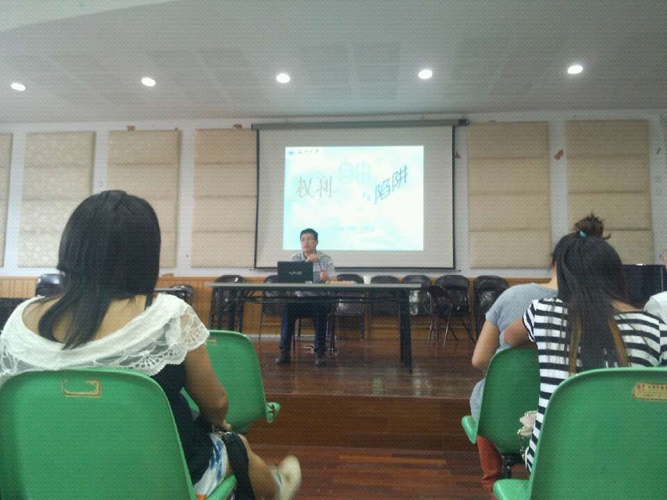 刚刚步入大学的新生们,最容易对周围的事物产生好奇,因此大一新生往往容易成为易受骗的群体,应对这一现象,2012年9月21日下午2点,威尼斯wnsr666在音乐楼201举办了一场“权利自由与陷阱——关于宗教信仰与传销的法律问题”讲座,并邀请了法政学院党总支书记王柏民教授给新生讲课。