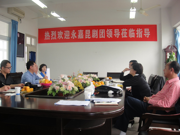 2012年4月11日上午,永嘉昆剧团团长刘文华等一行五人莅临我院参观交流。副院长王志毅副教授、王文韬副教授、各教研室主任以及办公室副主任全程接待。副院长王志毅老师就双方建立实践教学基地及准备在我院开设“永昆”课程进行了协商,并针对永昆教学大纲进行了细致的讨论。永昆领导们对我院开设永昆课程及建立教学实践基地给与了极大的肯定与支持。最后,在我院领导的陪同下一行人观光游览了校园风光,参观了专业教室、琴房、舞蹈房等教学场所。