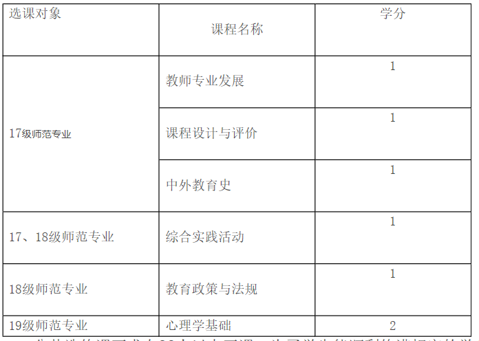 根据温州大学师范类专业本科人才培养方案,要求学生对教师教育类公共选修课必须修满6学分。根据培养方案课程设置,2019-2020-2学期开设的教师教育类公共选修课如下附表: