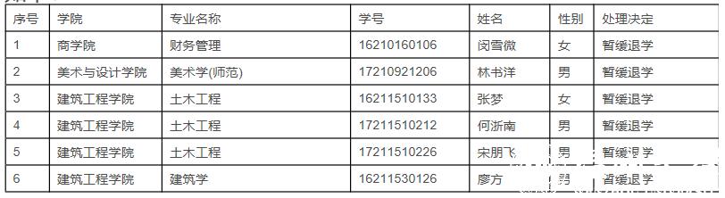 根据《温州大学本科学生学籍管理规定(2018年修订)》(行政〔2018〕13号)第二十九条、第三十条和第三十八条,经校长会议研究决定,拟对闵雪微等6名学生作暂缓退学处理,特此公示。
