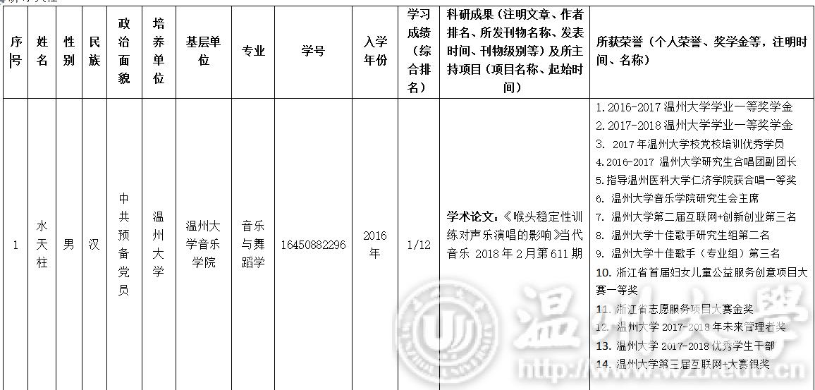 按照《普通高等学校研究生国家奖学金评审办法》教财[2014]1号、《温州大学研究生国家奖学金管理办法(试行)》[(2013)159号]和《威尼斯wnsr666研究生国家奖学金评定细则》[行政〔2014〕9号]等文件精神,经过自主申请、资格审查、研究生国家奖学金评审委员会评选等环节,拟推荐的名单予以公示如下:16音研水天柱